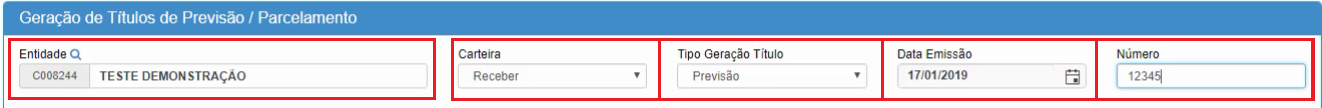 Para ter acesso a tal ferramenta na tela inicial clique sobre o menu >> Financeiro >> Gerar Previsão/Parcelamento. Na tela que se abre busque pela Entidade na qual deseja gerar a previsão ou parcelamento, selecione a Carteira (Pagar ou Receber) e logo após informe o Tipo Geração Titulo, se é Previsão ou Parcelamento.